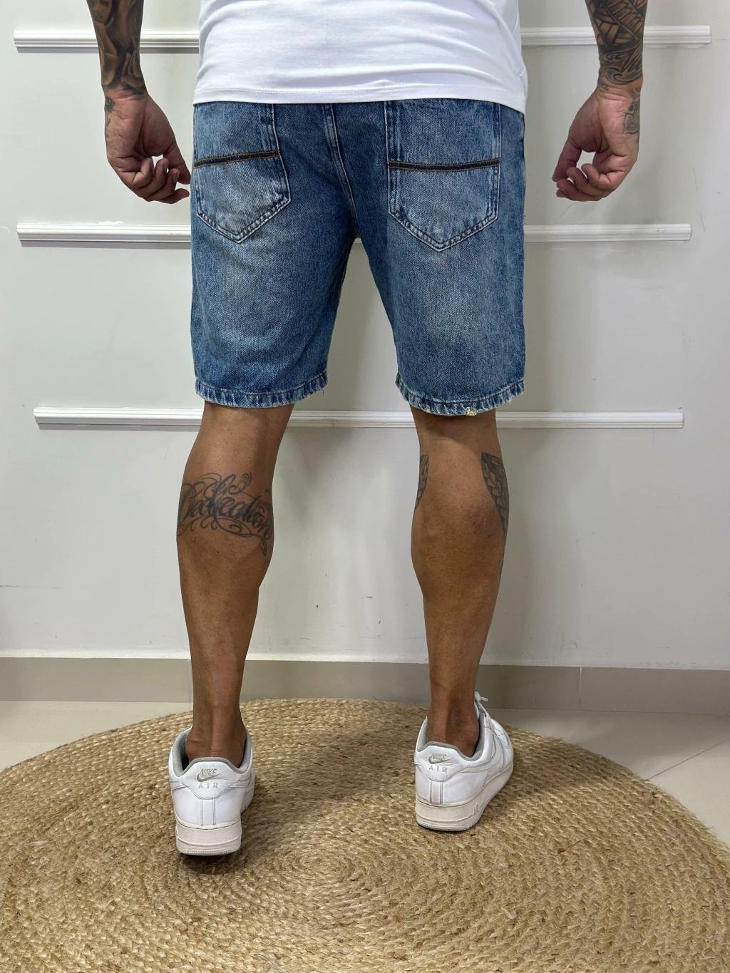 Bermuda Jeans Vintage Com Puidos a laser e Patch- 9797